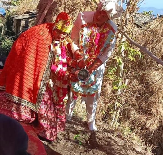 अल्मोड़ाः वर वधू ने घर के आंगन में समळौ॑ण पौधा किया रोपित, पर्यावरण संरक्षरण का दिया संदेश